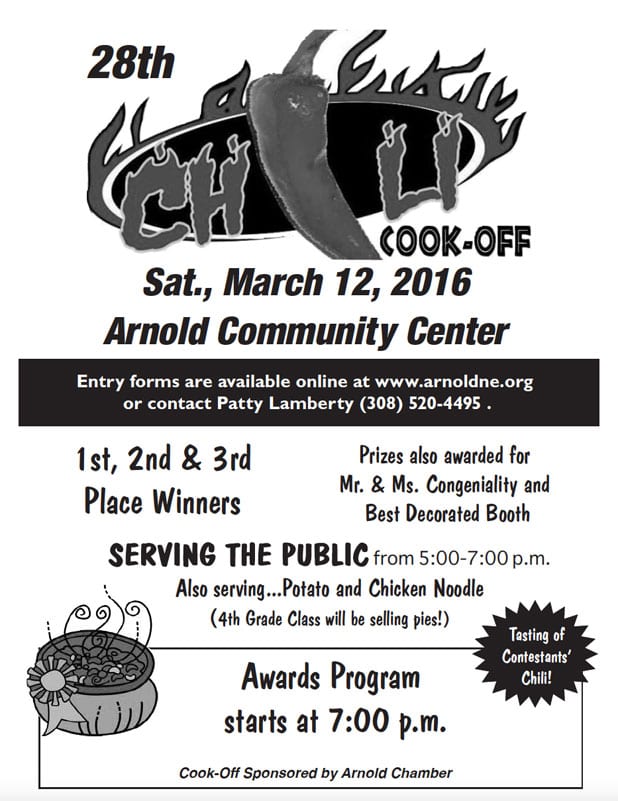 Public tasting of the chili and serving of potato and chicken noodle soup is from 5-7 p.m. The Arnold fourth grade class will be selling pies again as their annual fundraiser. At 7 p.m., emcee Deb Brosius will present the awards for first, second, and third place Best Chili, Mr. and Ms. Congeniality, and Best Decorated Booth.