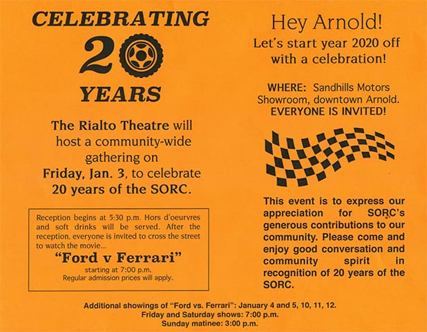 Details: Reception is at 5:30 at Sandhills Motors with hors d’oeuvres and soft drinks. Following the reception, everyone is invited to The Rialto Theatre for a showing of “Ford vs. Ferrari” starting at 7 p.m. (regular admission prices apply).