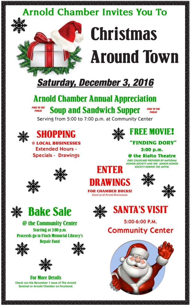 The Arnold Chamber's annual Christmas Around Town is set for Saturday, December 3, 2016. Be sure to take in all the events to kick off the holiday shopping season!