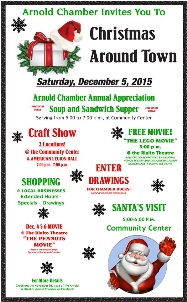 - Extended shopping hours at local businesses with holiday specials and prizes (see The Arnold Sentinel for times and/or specials)
