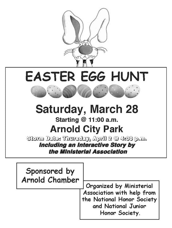 Bring your children to the annual Easter Egg Hunt at the Arnold City Park on Saturday, March 28, at 11 a.m., to find colorful Easter eggs hidden high and low. There will also be an interactive story by the Ministerial Association. This event is sponsored by the Arnold Chamber and is organized by the Ministerial Association with help from the National Honor Society and National Junior Honor Society. Storm date is Thursday, April 2, at 4 p.m.