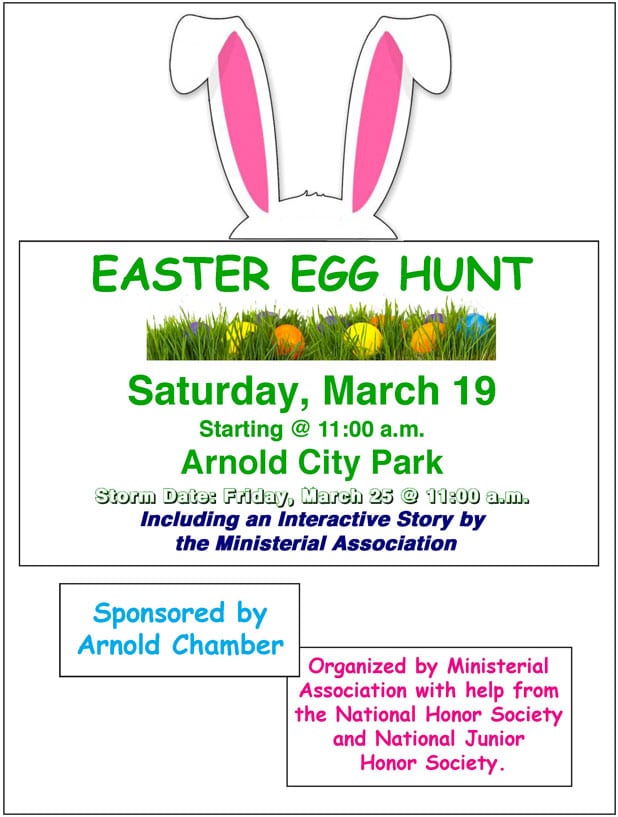 Bring your little ones to Arnold’s annual Easter Egg Hunt on Saturday, March 19. The search for colorful eggs and special treats left by the Easter Bunny begins at 11 a.m. at the Arnold City Park. (Rain date is Friday, March 25, at 11 a.m.). In addition to searching high and low, children will be treated to an interactive story by the Ministerial Association.