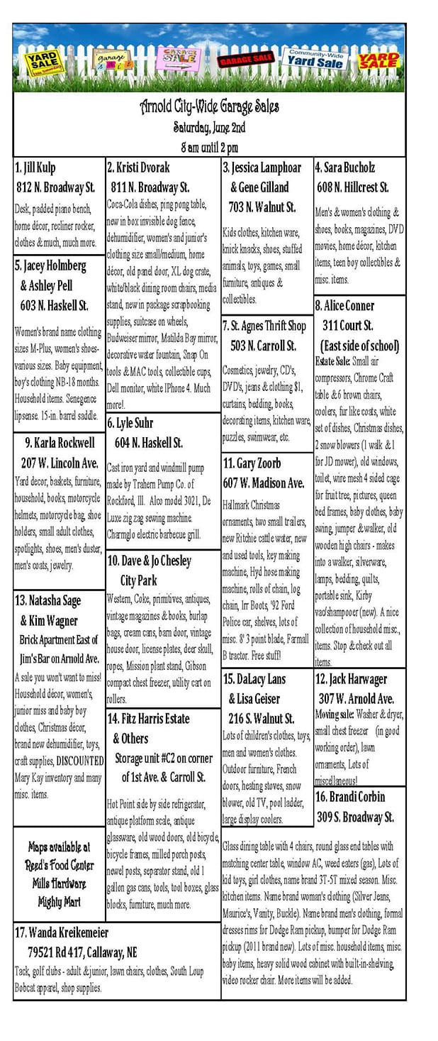 The Arnold city-wide garage sales listings and locations have been announced! This year's sales are looking to be as good as ever with listings showing everything from baby clothing, furniture, and decor to antiques, craft supplies, and tools—and much, much more. You won't want to miss your opportunity to find that special treasure you can't live without!