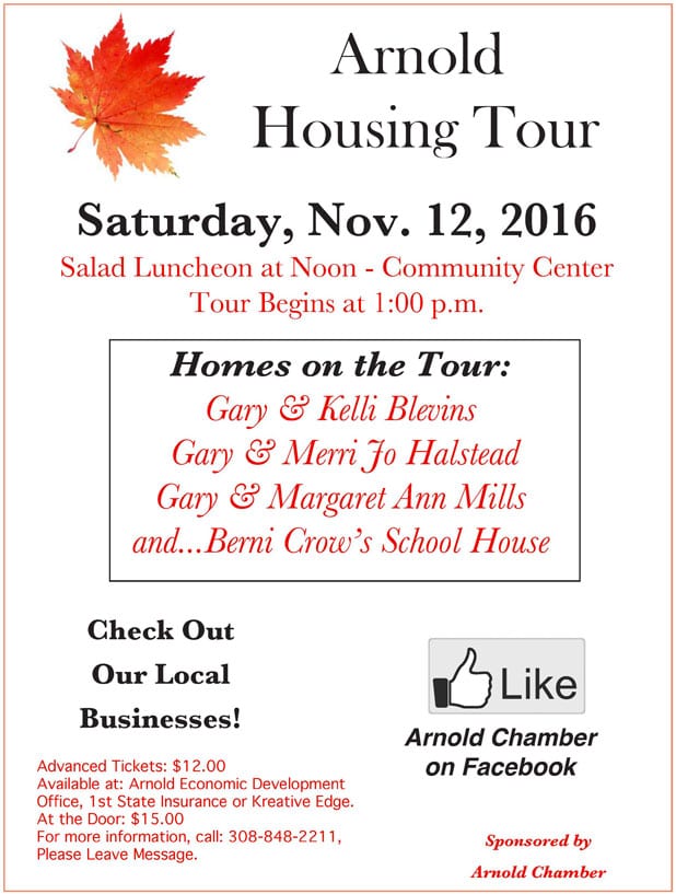 Advanced tickets are $12 and available at the Arnold Economic Development Corporation office, First State Insurance, or Kreative Edge. Tickets may also be purchased at the door for $15. The Arnold Housing Tour is sponsored by Arnold Chamber.