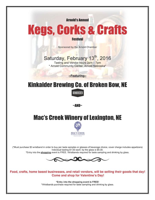 Arnold’s annual Kegs, Corks, & Crafts event is an opportunity to unwind from a long work week, sample Nebraska-made wine and beer, and shop for Valentine’s Day gifts. This year we are super excited to feature two popular vendors: Kinkaider Brewing Co. of Broken Bow and Mac’s Creek Winery of Lexington!